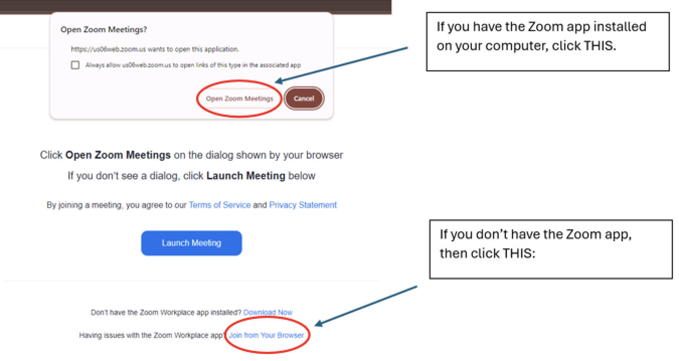 - If you have the Zoom app installed, click on the “Launch Meeting” button and follow that step in the picture below.